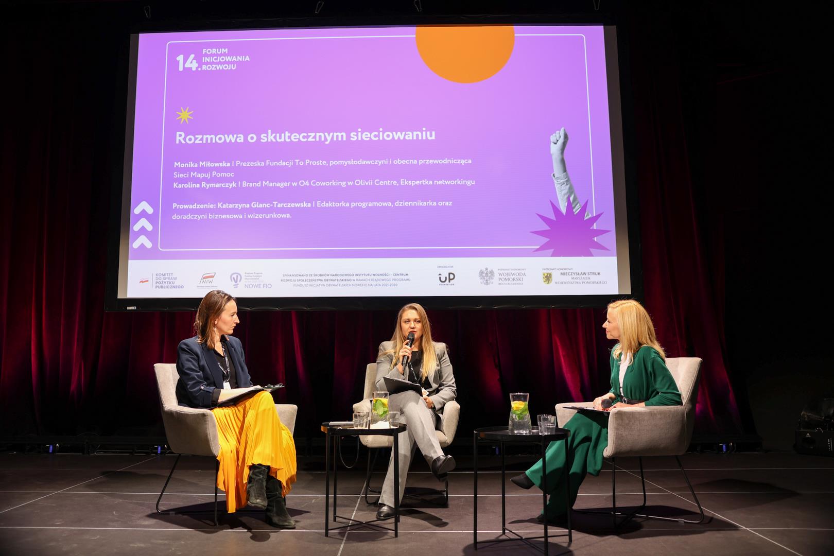 W kolejnej części Forum głos zabrały: Monika Miłowska (Fundacja To Proste, Sieć Mapuj Pomoc), Karolina Rymarczyk (O4 Coworking, Olivia Centre) oraz Katarzyna Glanc-Tarczewska – redaktorka, dziennikarka i doradczyni wizerunkowa. Ich rozmowa była pełna energii i praktycznych wskazówek. Panelistki mówiły o odwadze w opowiadaniu o swojej pracy, o roli „łączników” w społecznościach, o mapowaniu sieci, a także o kulturze dialogu, uznania i partnerskich relacji. Jak podkreślono: „Nie chodzi o oklaski, ale o sens i wspólnotę celu”.